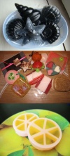 У меня есть грамм 400 прозрачной мыльной основы (куплена в инет магазе, могу точно взвесить), набор формочек (для детей)- кит, рыбка, рак, звездочка, красители (специально для мыла)- красный, синий, желтый и оксид титана (он применяется для замутнения мыла).
