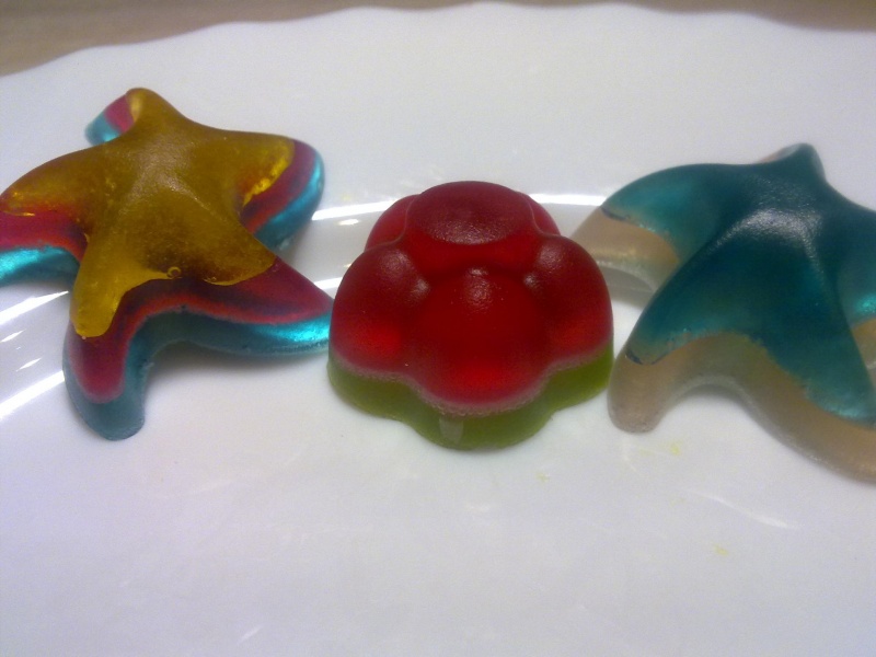 В закромах нашлось масло репейное, масло пихтовое и детское мыло НК с зайчиками и краски для яиц с Пасхи остались. На все про все (от начала до замерзания) ушел всего час. Пихта что-то выветрилась уже (но запах у масла был не айс), и краска в мыле расплылась за ночь. Мылится нормально, и запах как у просто мыла.
