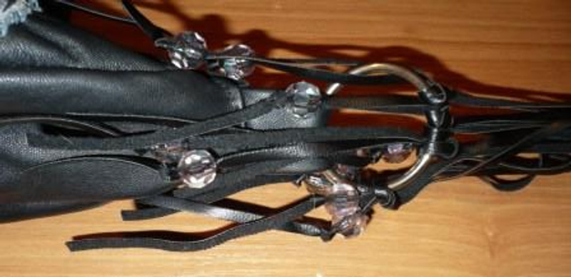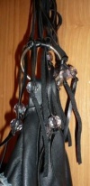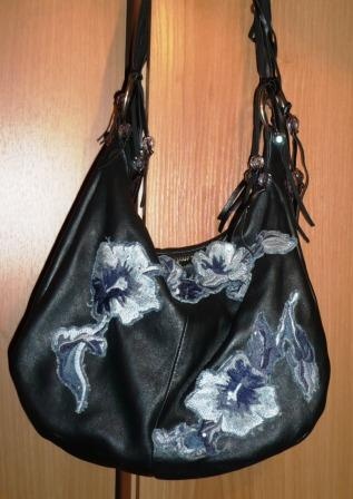 * кожаная объемная сумочка с цветочной аппликацией из джинсовой ткани, ручка через плечо из шнурков ,украшенных бусинами. Моделька на повседневку.