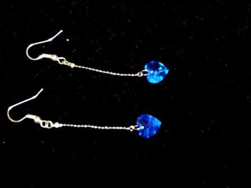 Серьги из кристаллов "Сваровски" в форме сердечек с огранкой, ярко-синего цвета с одной стороны, и зеркальной с другой. На просвет они нежно розово-голубые. Зажимы,цепочка,колечки,швензы - все это есть в продаже в отделах фурнитуры.