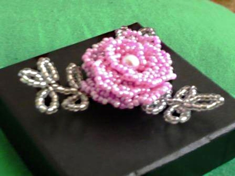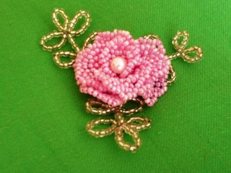 Брошь "Камелия", выполнена из бисера на леске и проволоке, украшена бусиной "под жемчуг", микс из техник плетения .