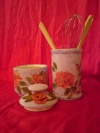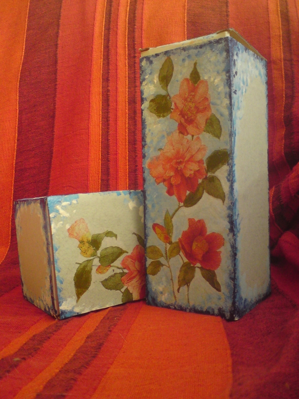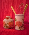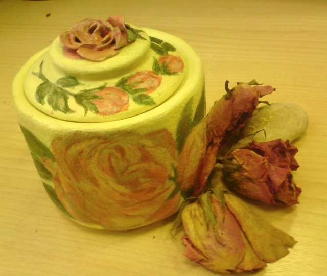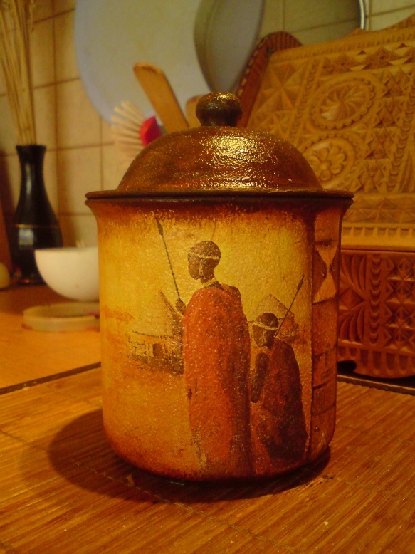 • Это последняя работа. Я расписала стеклянную банку от чая. Получился гламурный предмет интерьера, в котором можно хранить чай или кофе.