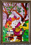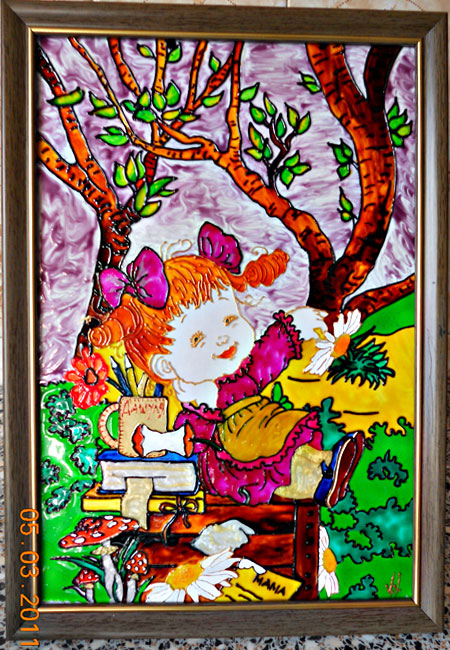 Выполнена на стекле витражными красками, размер А4, краски немецкие, очень хорошего качества с красивым глянцевым блеском