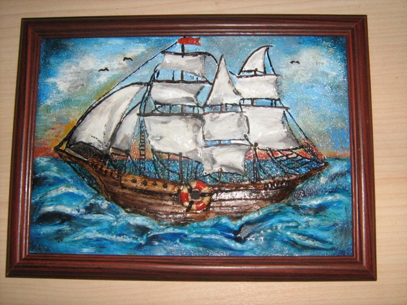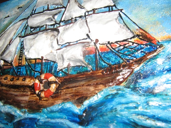• Объемная картина, сделана на заказ. На картине полностью объемный парусник (борт, паруса, мачты, канаты) объемные волны. Картина в подарокдля молодого человека, который в прошлом служил в ВМФ.