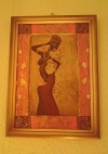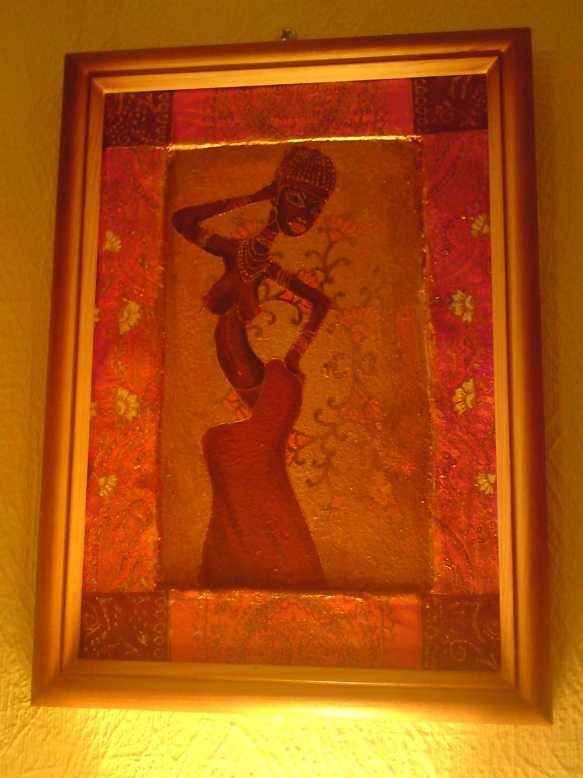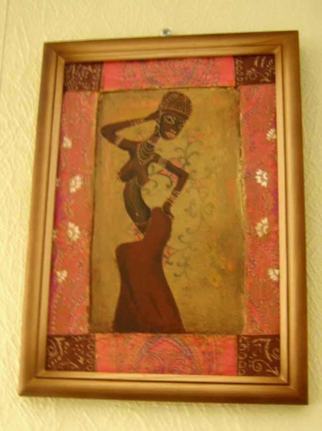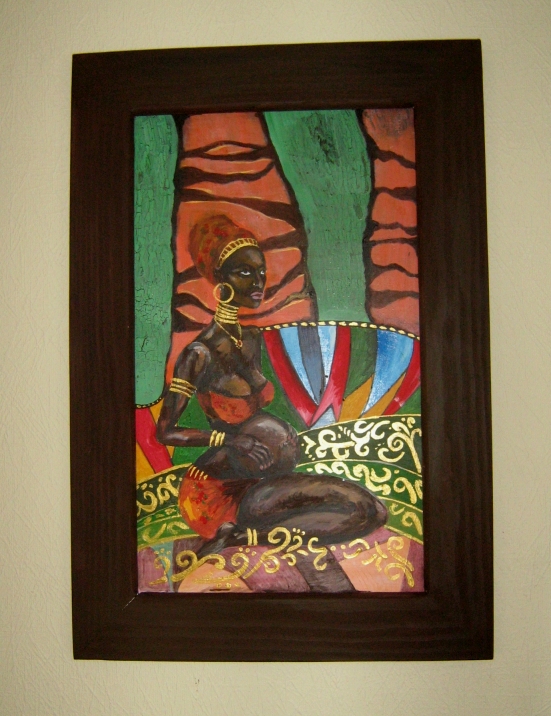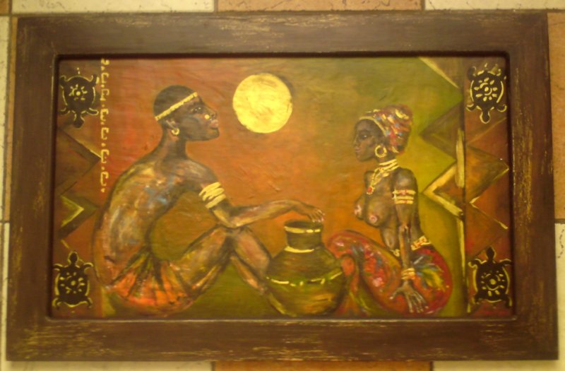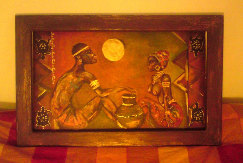 • Картина на стекле выполнена в африканском стиле, выпонена акриловыми красками для стекла и покрыта лаком. Я выполнила картину в этническом стиле и иммитировал старину, наскальные росписи и этнические рисунки народов Африки. Я сделала красками фальш-раму иммитирующую состаренное дерево. В центре композиции изображена сцена охоты, а обрамлена картина символами солнца и луны.