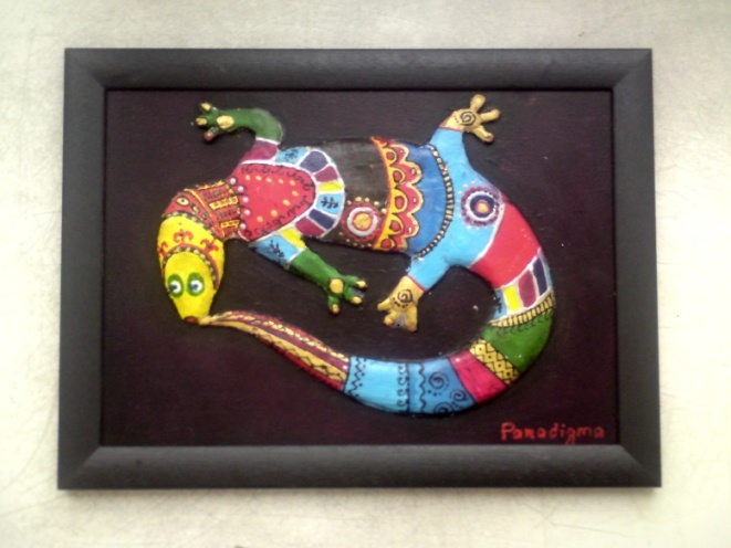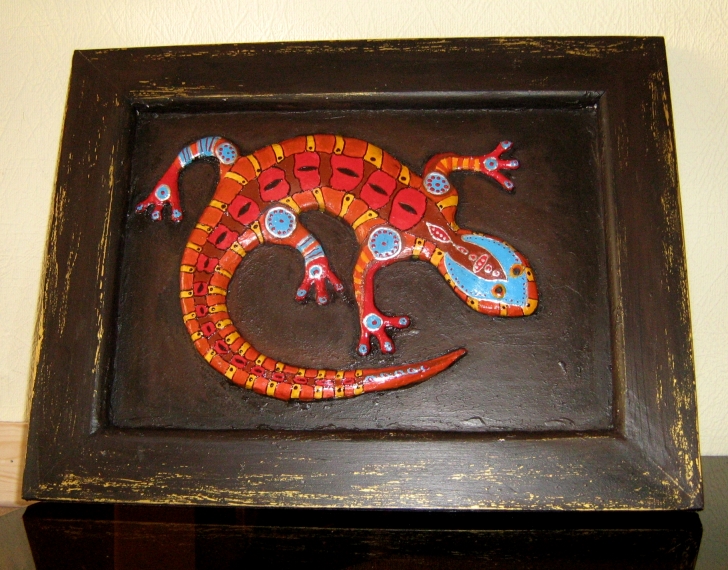 • Картина с объемной ящерицей. В широкой деревянной раме, рама искусственно состарена под черное дерево с позолотой