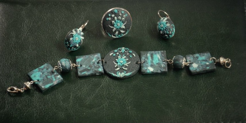 В работе используется полимерная глина, стеклянные бусины, металлическая фурнитура, деревянные основы. Применяются самые разные техники изготовления украшений.