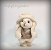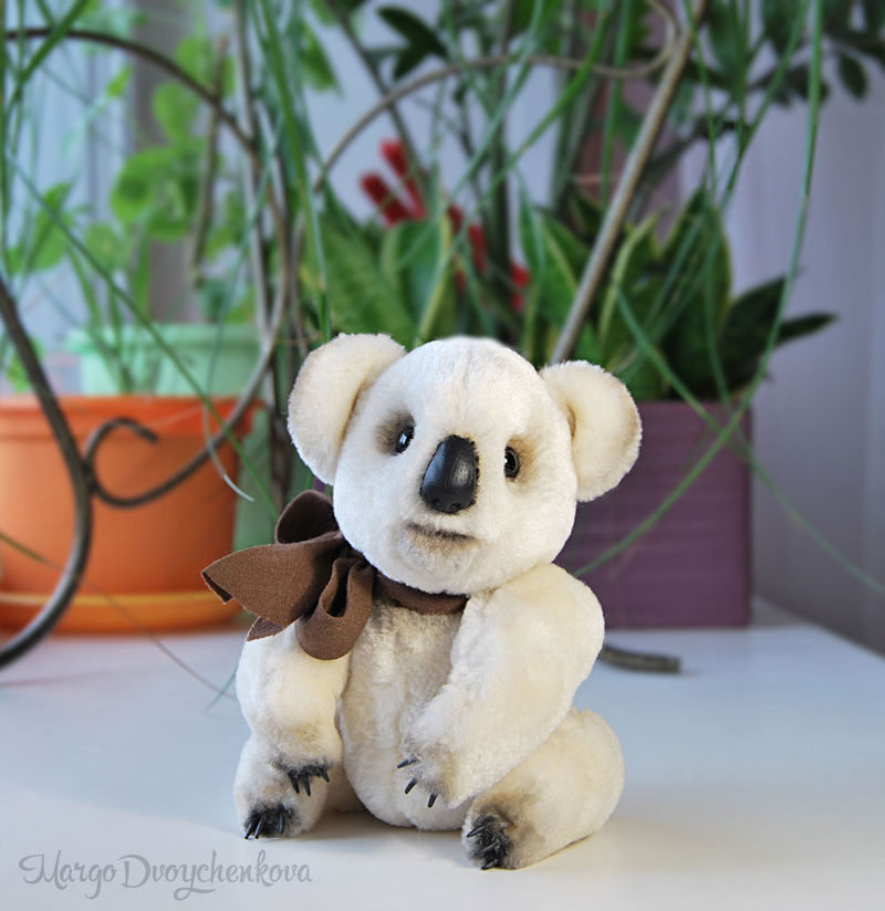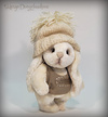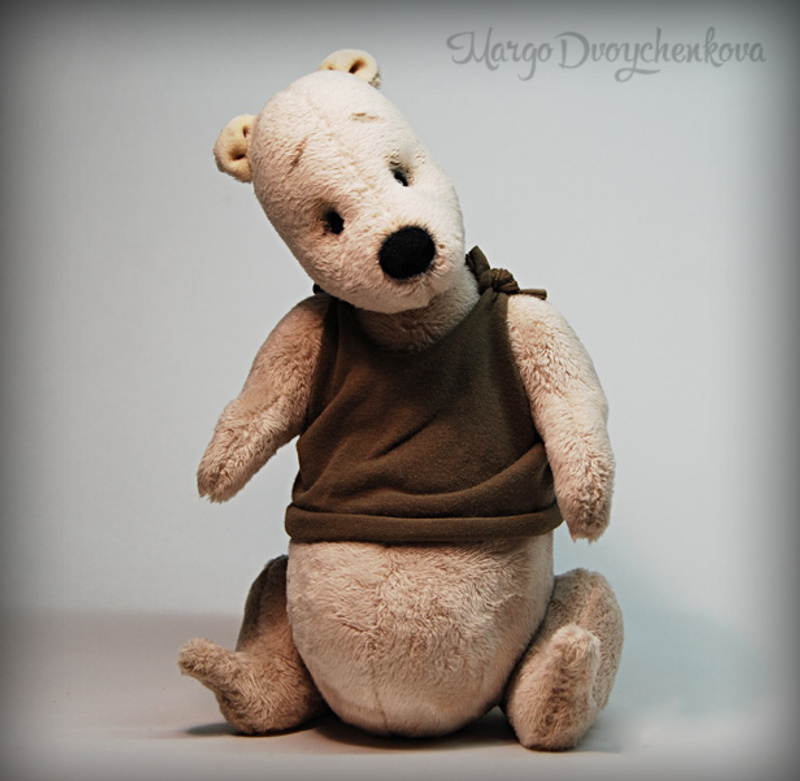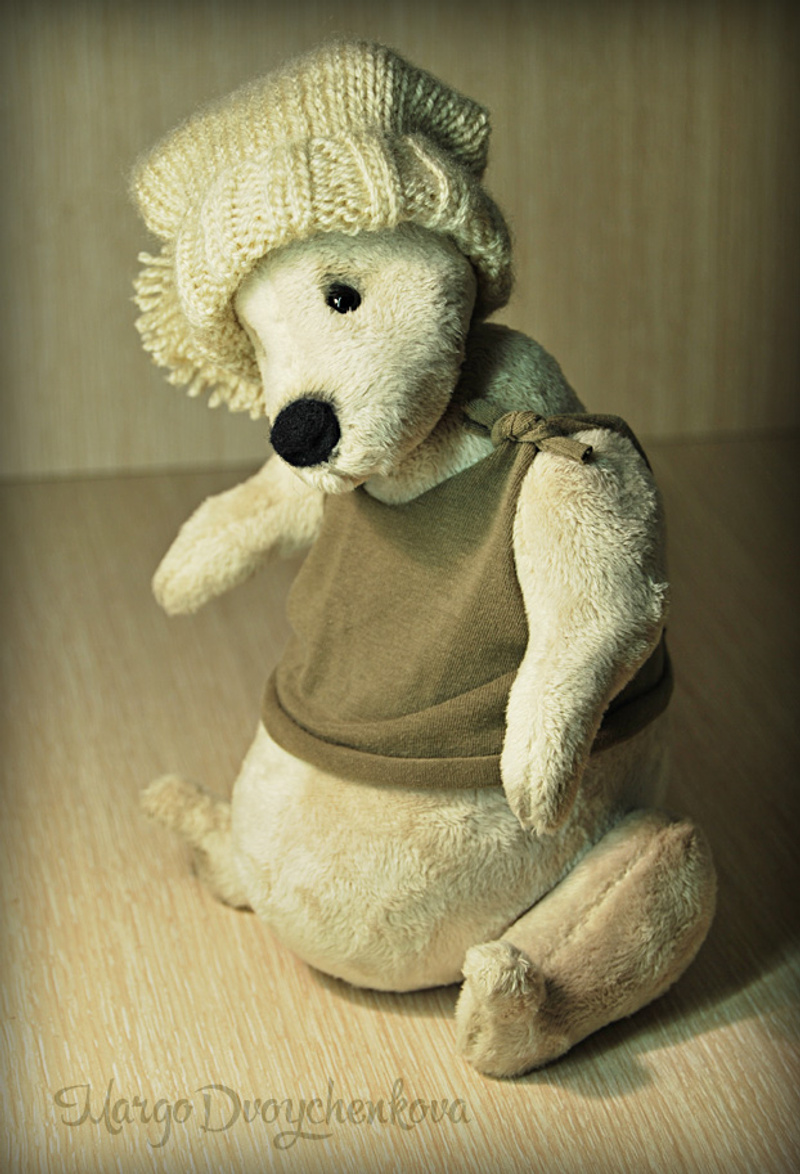 Выполнен полностью вручную по авторской выкройке из искусственного меха цвета "молоко", набивка синтепух, утяжелён металлическим гранулятом, 6 шплинтов, глазки стекло, тонировка художественным маслом и маркерами, носик и коготки слеплены из двухкомпонентного пластика, все четыре лапки армированы.