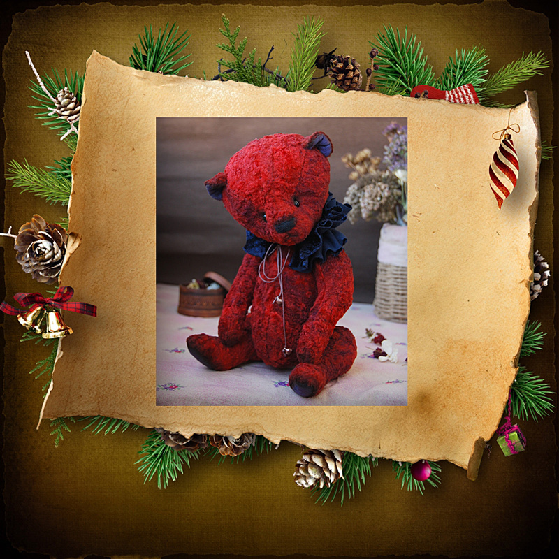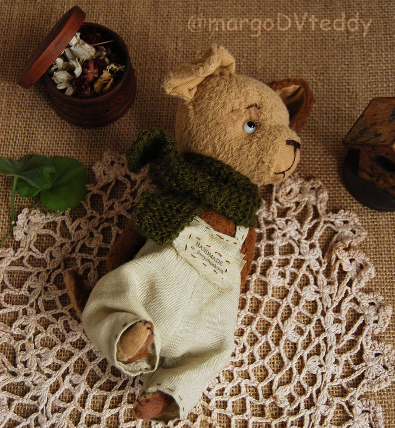 Технические подробности: выполнен полностью вручную по авторской выкройке из немецкой вискозы, внутри опилочки, утяжелён минеральным гранулятом, крепления, как у всех Тедди, подвижное-шплинтовое, головушка на двойном качающемся креплении, глазки стеклянные, тонировка художественными маркерами.