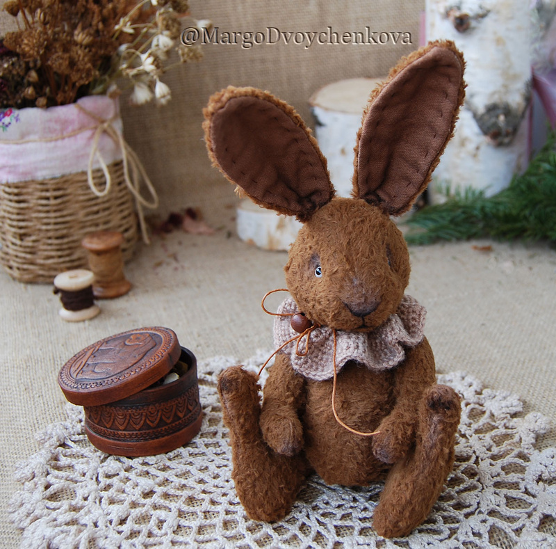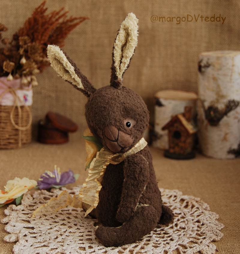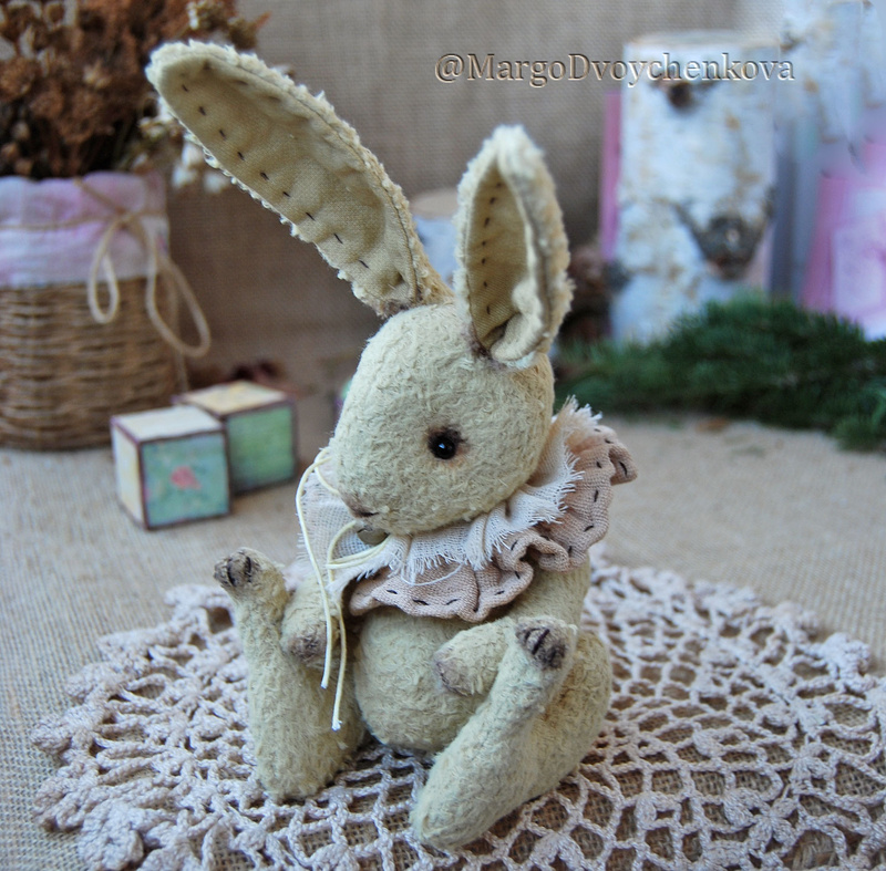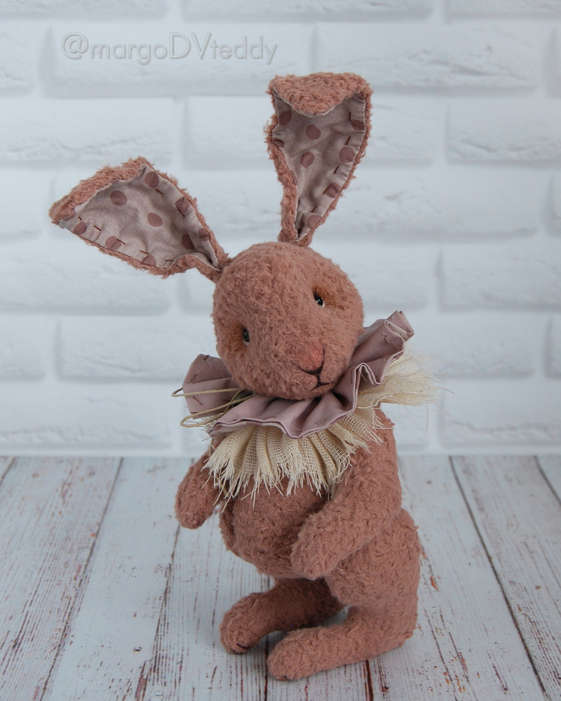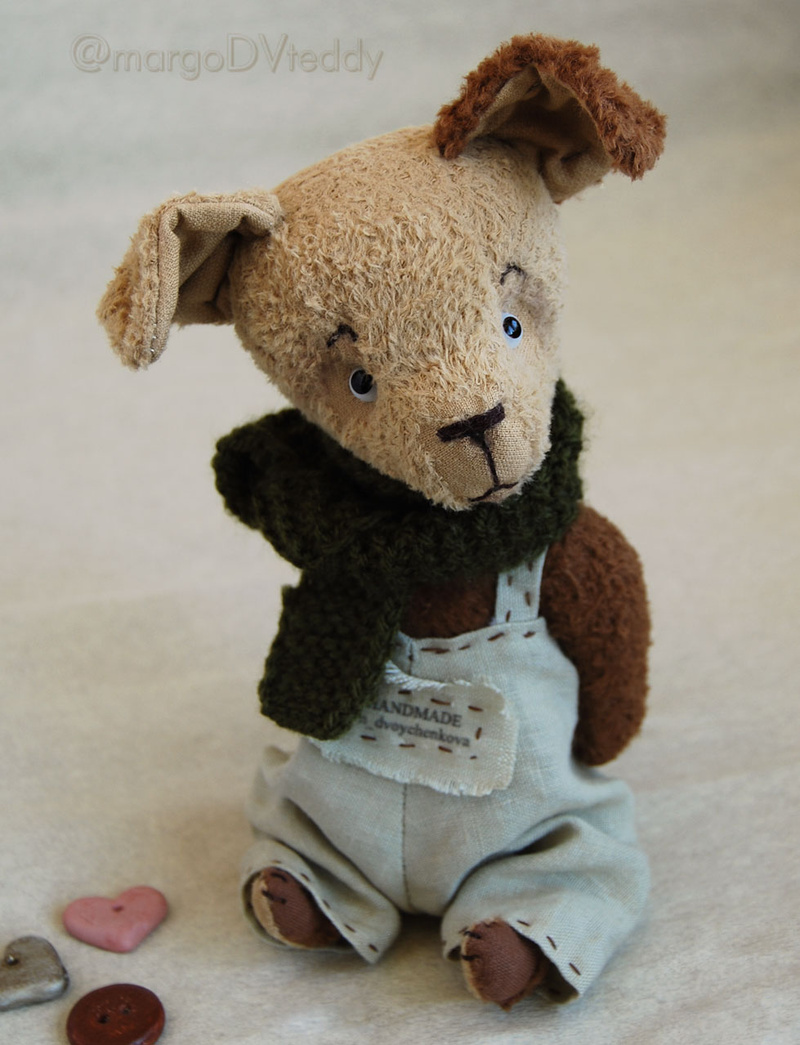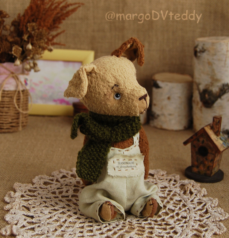 Технические подробности: выполнен полностью вручную по авторской выкройке из немецкой вискозы, внутри опилки, утяжелён металлическим гранулятом, крепления все подвижные (5 шплинтов), глазки стеклянные, ушки и хвостик армированы, тонировка художественными маркерами. Одежда снимается.