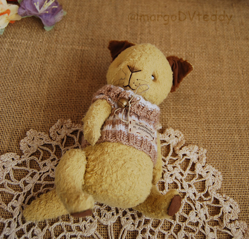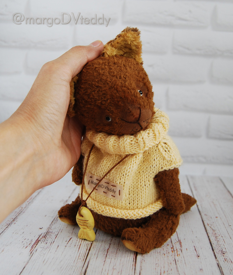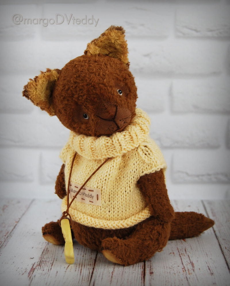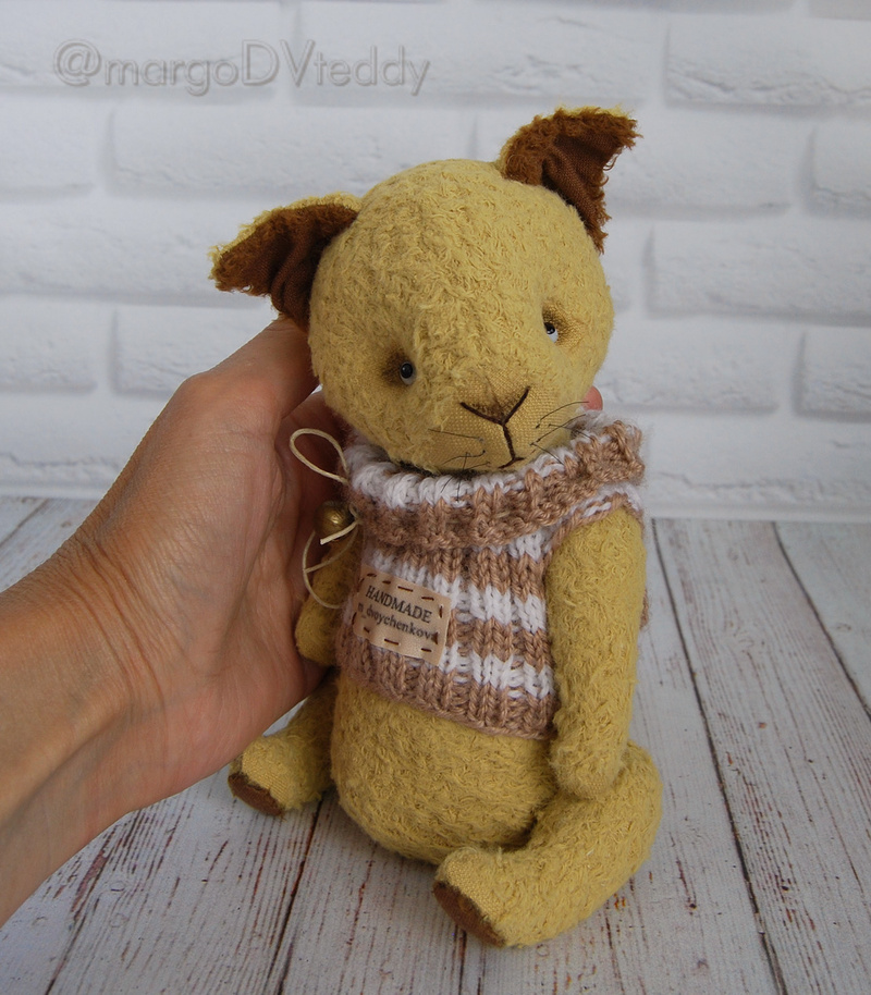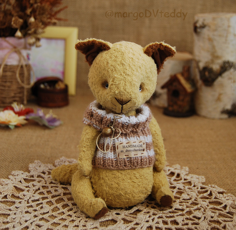 Технические подробности: выполнен полностью вручную по авторской выкройке из двух видов немецкого мохера, внутри синтепух и металлический гранулят (для утяжеления), крепления все подвижные на 6 шплинтах, глазки немецкие стеклянные, тонировка художественными маркерами. Рост около 11 см. Умеет стоять, сидеть, лежать и может принимать разные смешные позы. Имеет Паспорт игрушки.