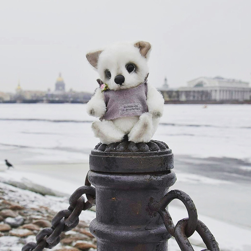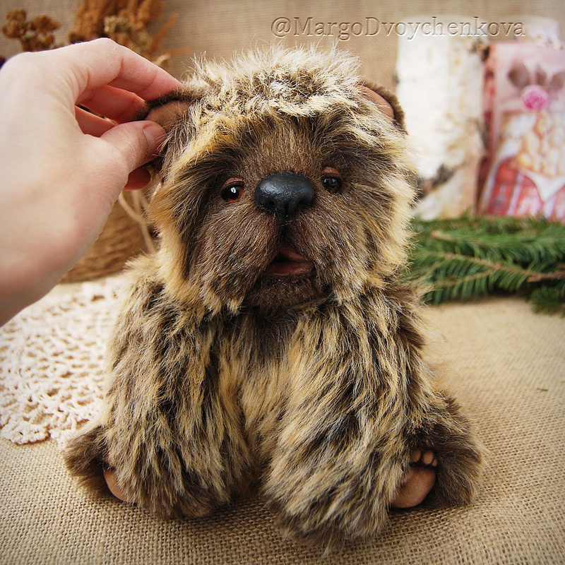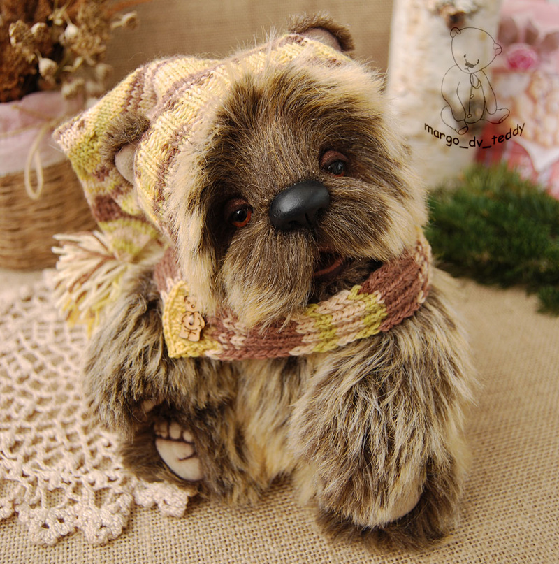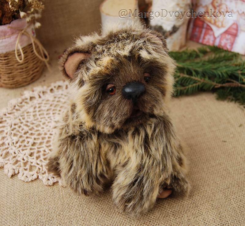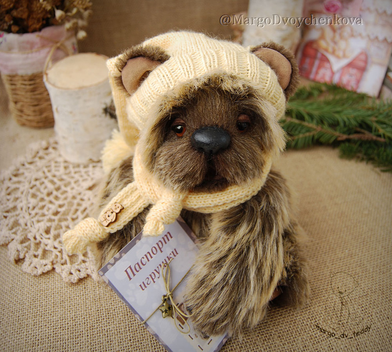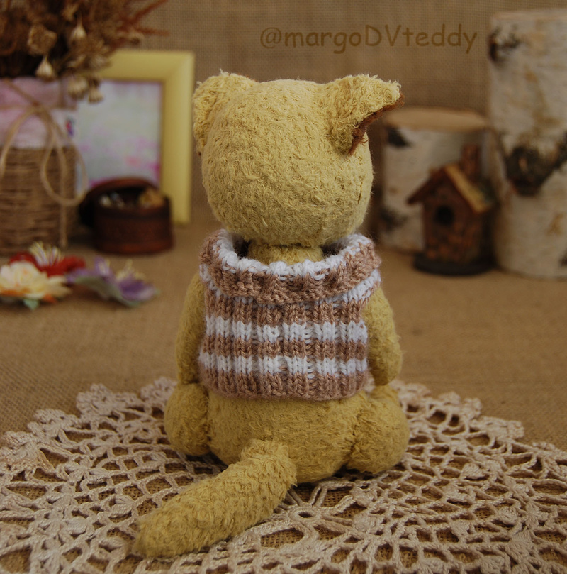 Технические подробности: выполнен полностью вручную по авторской выкройке из двух видов немецкого мохера, внутри синтепух и металлический гранулят (для утяжеления), крепления все подвижные на 6 шплинтах, глазки немецкие стеклянные, тонировка художественными маркерами. Рост около 11 см. Умеет стоять, сидеть, лежать и может принимать разные смешные позы. Имеет Паспорт игрушки.