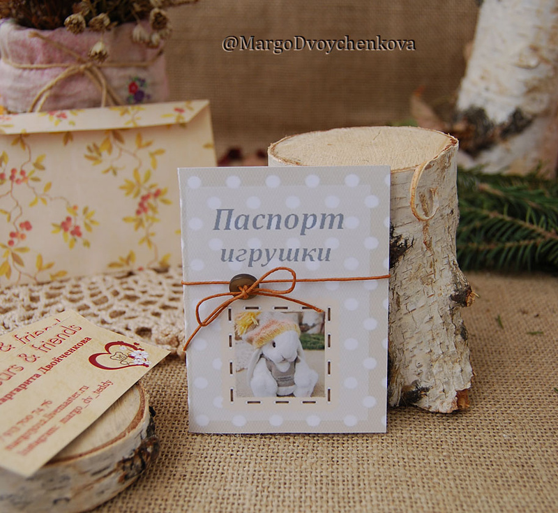 Рост 19 см без ушей, 26 см. с ушками. Стоять самостоятельно не умеет, сидит с удовольствием. Имеет документ, удостоверяющий личность - Паспорт игрушки