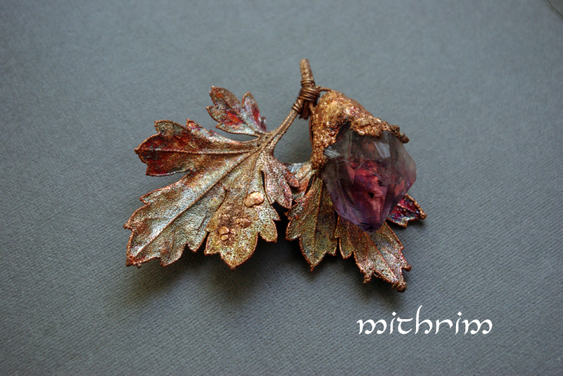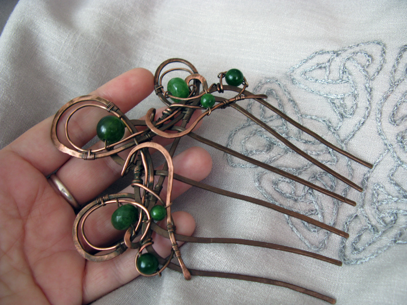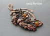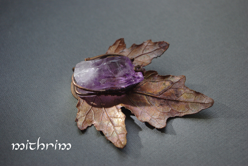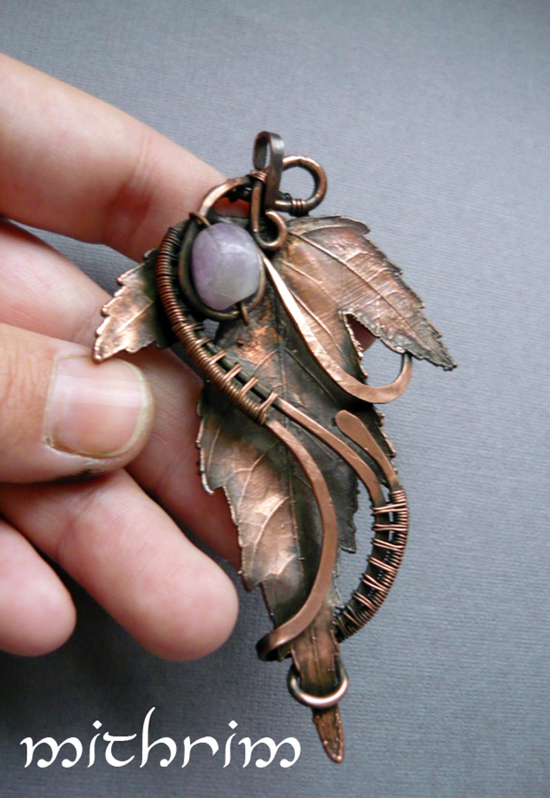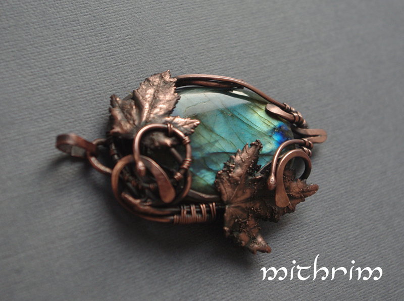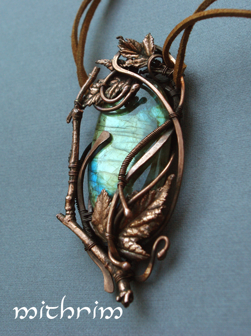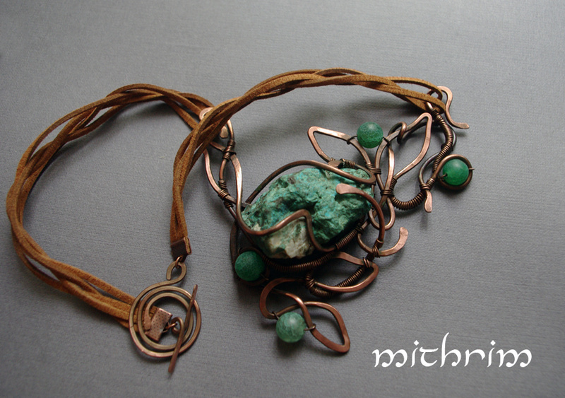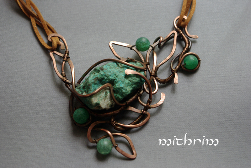 Сейчас делаю их из меди, методом холодной ковки и горячего обжига в некоторых местах. Камни натуральные или стекло. Больше всего люблю необработанные, природного вида камни, поэтому кабошоны использую редко.