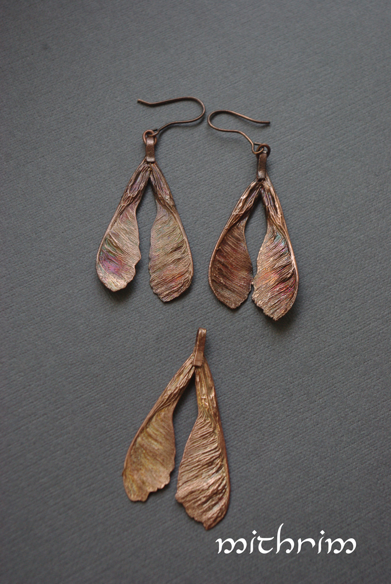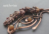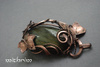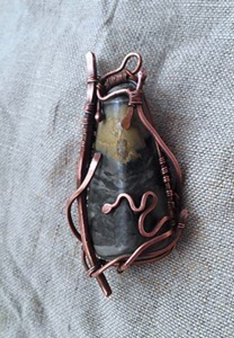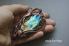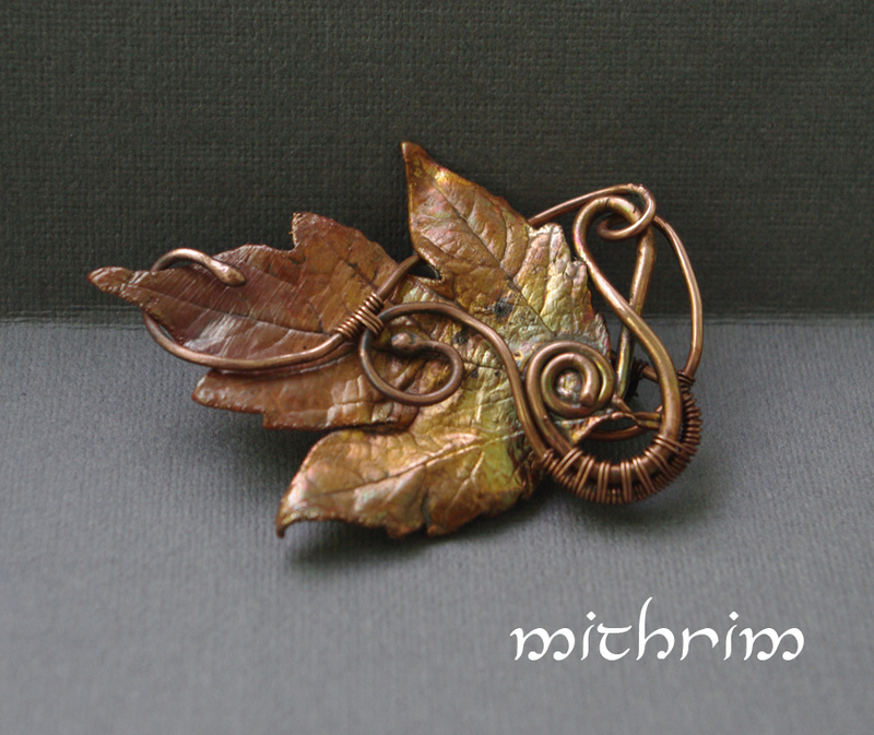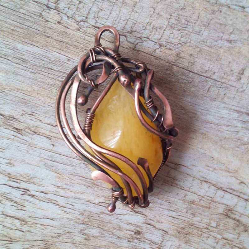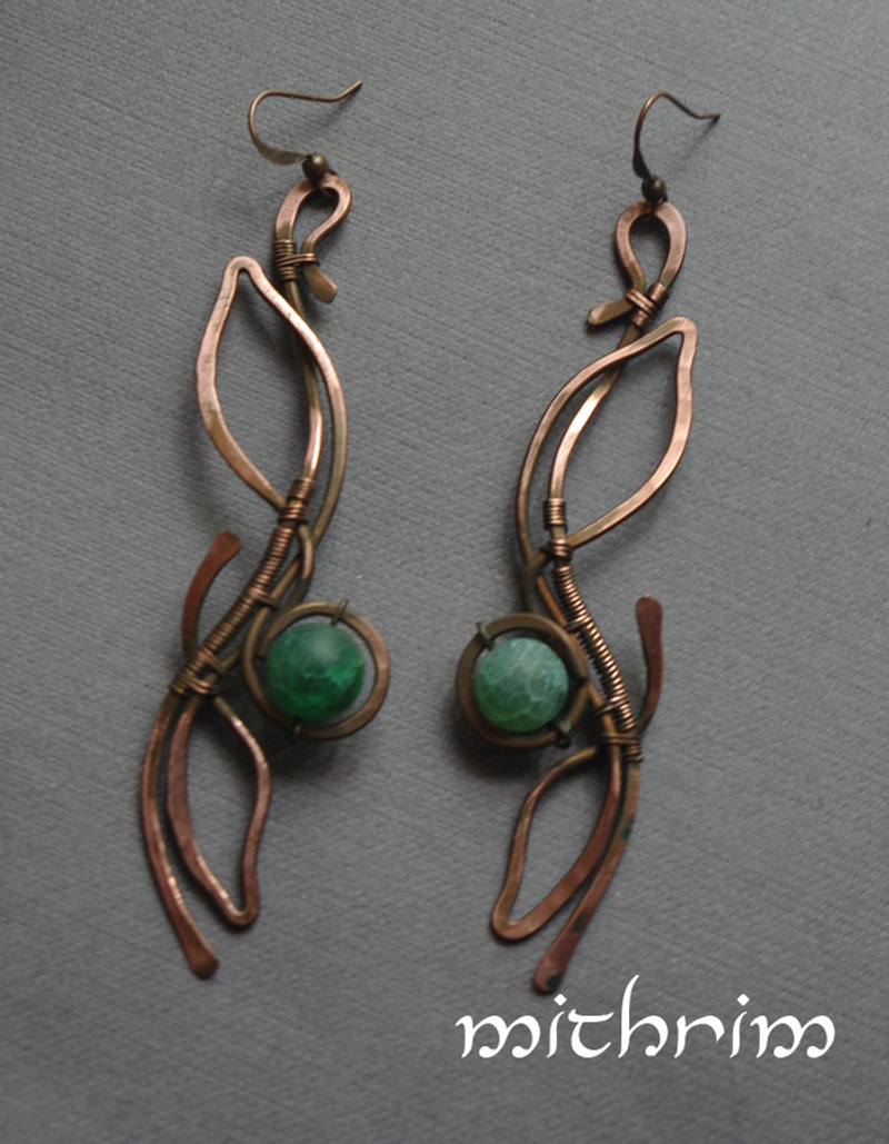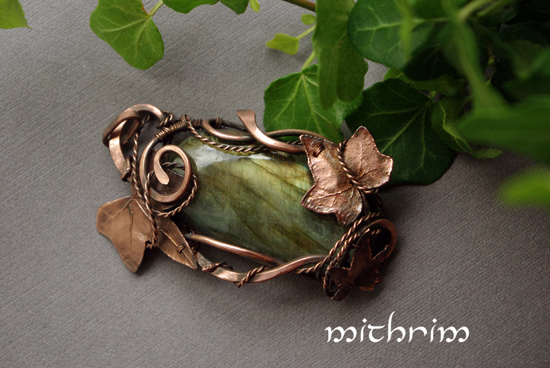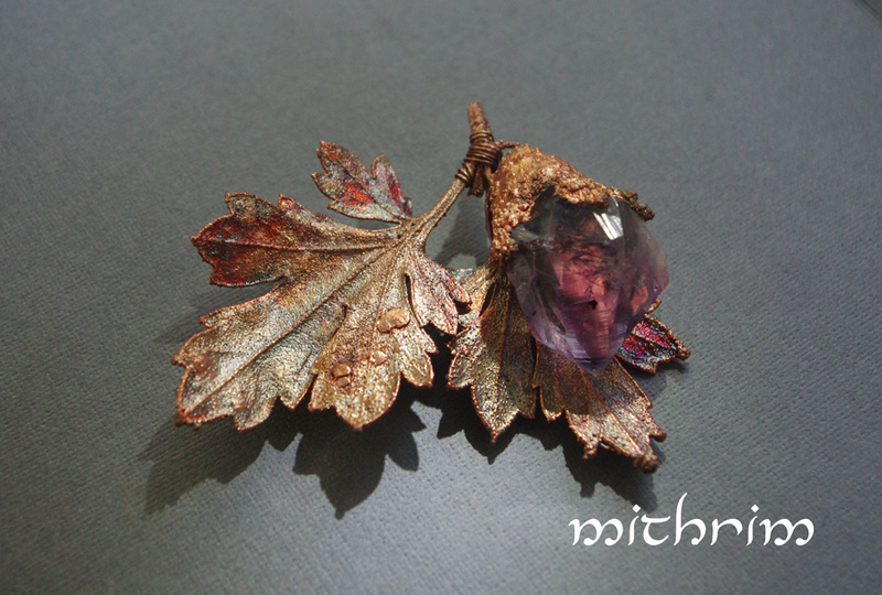 Сейчас делаю их из меди, методом холодной ковки и горячего обжига в некоторых местах. Камни натуральные или стекло. Больше всего люблю необработанные, природного вида камни, поэтому кабошоны использую редко.