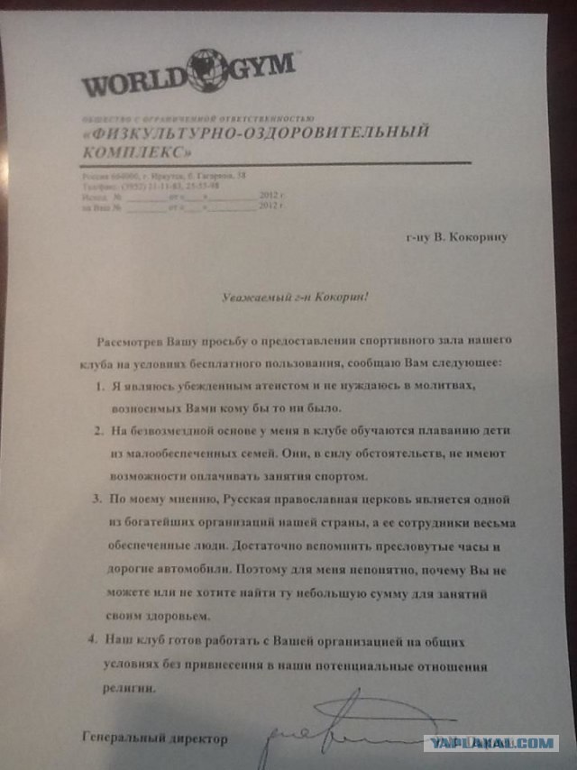"В Иркутской епархии ответ World Gym приняли стоически.
