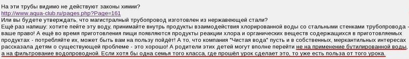 Ещё раз напишу: хотите пейте эту воду, принимайте внутрь продукты взаимодействия хлорированной воды со стальными стенками трубопровода - ваше право! А ещё во время приготовления пищи появляются продукты реакции хлора и органических веществ содержащихся в приготовляемых продуктах - потребляйте их, может быть вам на пользу пойдёт! А то, что компания "Чистая вода" пусть и в собственных, меркантильных интересах рассказала детям о существующей проблеме - это хорошо! А родители этих детей могут вполне перейти не на применение бутилированной воды, а на фильтрование водопроводной. Если хотя бы одна семья того класса, где прошёл урок сделает это, то уже есть польза от того урока.
