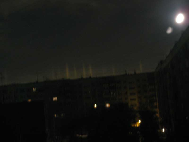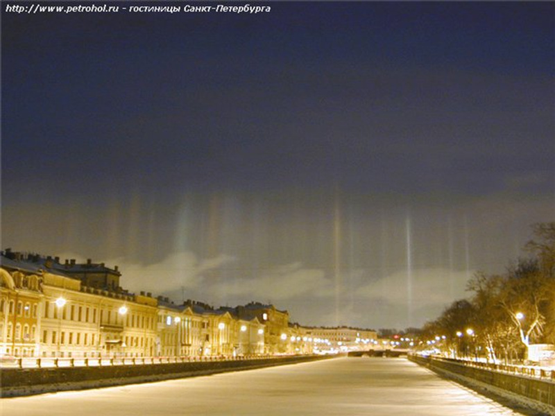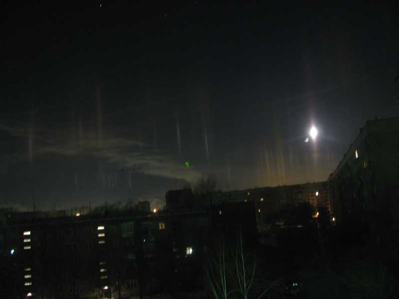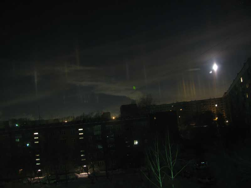 На Выборной, окна на Ю-З, частенько такое по ночам наблюдаю (световые столбы, обычно 6-10 шт) Грешил на чо-то другое, типа прожектора в небо.то что вы наблюдаете - это вот что. иногда в воздухе падают мелкие плоские кристаллики льда. падают они плашмя (таковы законы гидродинамики). поэтому получается, что в воздухе развешано множество горизонтальных зеркалец. в таких условиях свет от фонаря, который светит во все стороны равномерно, отражается в глаз наблюдателя, только от тех пластинок, которые над и под фонарём, причём на любой высоте. в итоге выглядит это как столб света над (а вообще говоря и под) любым световым источником. такое явление бывает не очень часто, поскольку нужны эти самые кристаллики и полностью безветренная погода. и только зимой, разумеется. но и нельзя сказать, чтоб крайне редко, за каждую зиму несколько раз случается.Пробовал сфотать, ничего не видно.