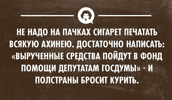 • В ответ на: да не сработает. Если куряке/курице на своё и своих детей пофиг, неужто он поведётся на какую-то надпись? тем более власть имущие и так кормятся с сигарет