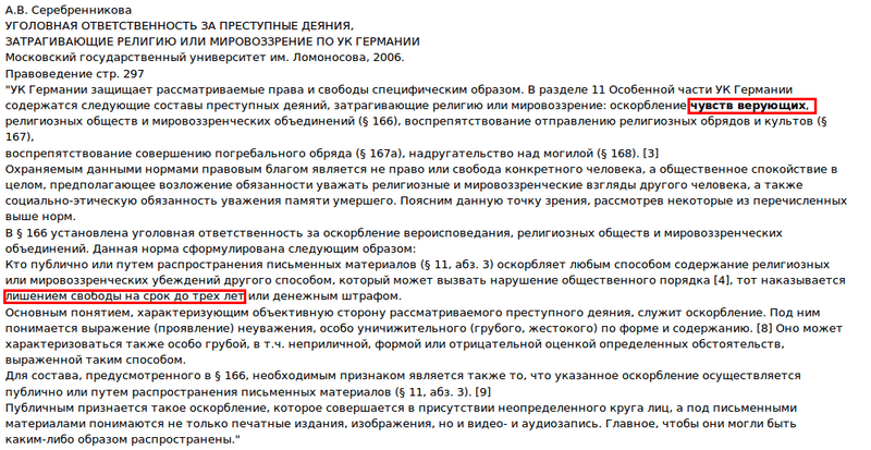 государство вправе принимать меры государственно-правового (втом числе уголовно-правового) реагирования для того, «чтобы у отдельных людей не сложилось ощущения, что их религиозные представления стали объектом необоснованных и оскорбительных нападок» (§ 56 постановления по делу «Институт Отто-Премингер против Австрии»).
