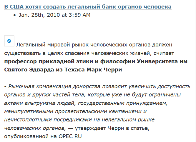 Поучительная история , Россия . Школьники 9го класса пошли сдавать мед.анализы , а очутились в псих.больнице , где их начали готовить к изъятию органов .. Спасительный звонок родственникам от одной медсестры (иной работницы?) , которая потом исчезла , позволил экстренно среагировать родителям и отбить своих детей из рук черных трансплантологов . Видео из двух частей- роликов -кажд. ок. 10 мин. , много раз пытался выложить ссылки , но первый ролик не открывается на форуме , а при наборе в поисковике Ютьюба - открывается . Поэтому наберите в Ютьюбе по названию : "Родители отбили своих детей , которых хотели изъять на органы АЛДЕКС.."