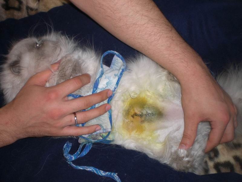 я и так расстроилась... Сегодня вечером после работы повезем Кнопи в Сириус. Я утром снова обработала ей шов. Вы не думайте, что рана прям уж такая мокрая, просто фото было сделано сразу после обработки хлоргексидином, он просто еще высохнуть не успел, поэтому, кажется, что все мокро. Там только самая верхняя ниточка, видимо, гноится, остальные абсолютно сухие... а вот гематома меня очень беспокоит. Ее в первый день, как я забрала кошку не было... Она на второй день начала появляться, потом увеличилась вот до таких размеров... сейчас остается такой же, не растет, но и не уменьшается.
