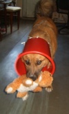 Существуют, конечно, и пластиковые прозрачные воротники послеоперационные для крупных собак - но собаки их ломают на раз-два. Ведро намного прочнее. Она сможет в нем спать, есть и пить - но не сможет лизать попонку. Что и необходимо.