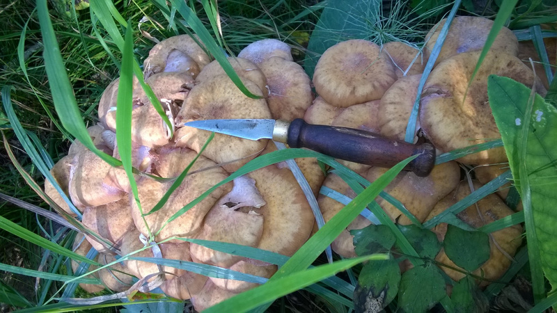 Приехал домой, а дома не сидится. Поехал в 14.20 на электричке до ст. Жеребцово. Шарился примерно между Раздольным и Гусиным бродом. В итоге - опят гораздо меньше, чем в прошлом году в тоже время в тех же местах, опята в основном размером с горох, резать такие ни к чему, но есть деятели, которые этим занимаются. Но в итоге попадались более менее солидные по раз меру семейки и даже переростки?!... Даже 7л ведра не наскреб, хотя попалось ещё десяток груздей и штук 7 - 8 лисичек. Все вместе на икру сгодится.