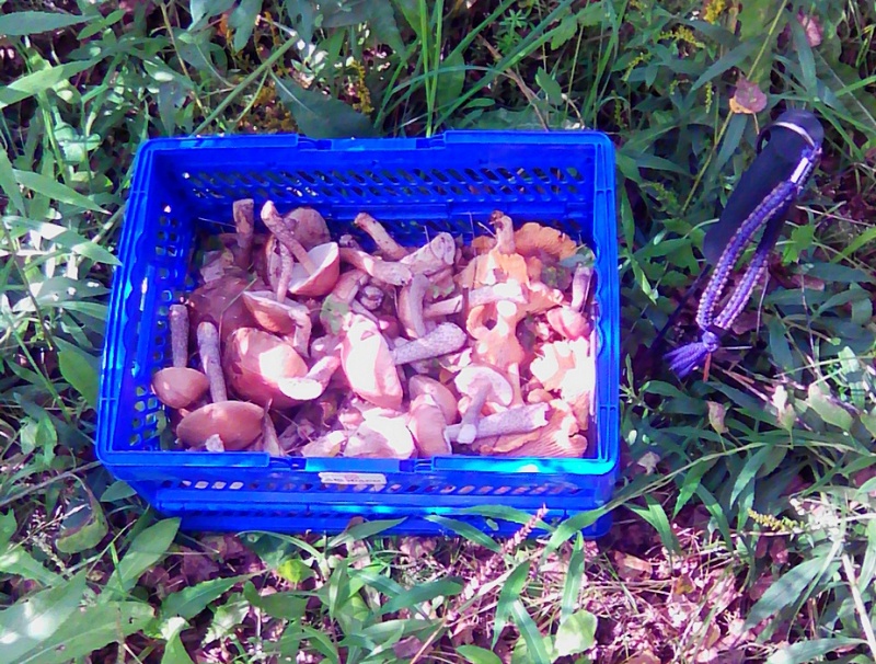 Вообще,когда понял что поперло,брал только подберезовики,белые и грузди,хотя грибов было немеряно и других(сыроежки,валуй,свинухи,волнушки и.т.п),попалось несколько черных груздей,в основном мелкие и одиночные,груздь только осиновые и тополевый,в березняке 0.Попалась маленькая полянка лисичек,молодые и средние,переростков нет.Лес хороший,сырой.Комары и мошки почти не доставали,рефтамид силий работал норм.Грибников не было,что радовало.Когда я вышел на полевую дорогу то понял,почему.Весь прошлый день и ночь шел дождь,а полевые дороги сами понимаете..Короче только отмороженые грибники-фанатики по такой бы поехали несколько км.,только высокий ВД или трактор,вот тут я злорадно подумал,что ноги в этот раз лучше-чем колеса:))