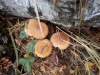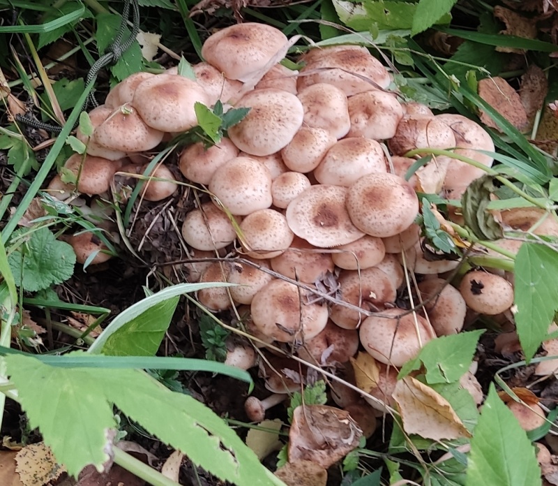 А что это за грибы? Совсем как опята, на снимке не очень видно, что жёлтые, видел ярко-жёлтые, на берёзовом пне, шляпка с крапинками, мантия на месте, опята опятами.