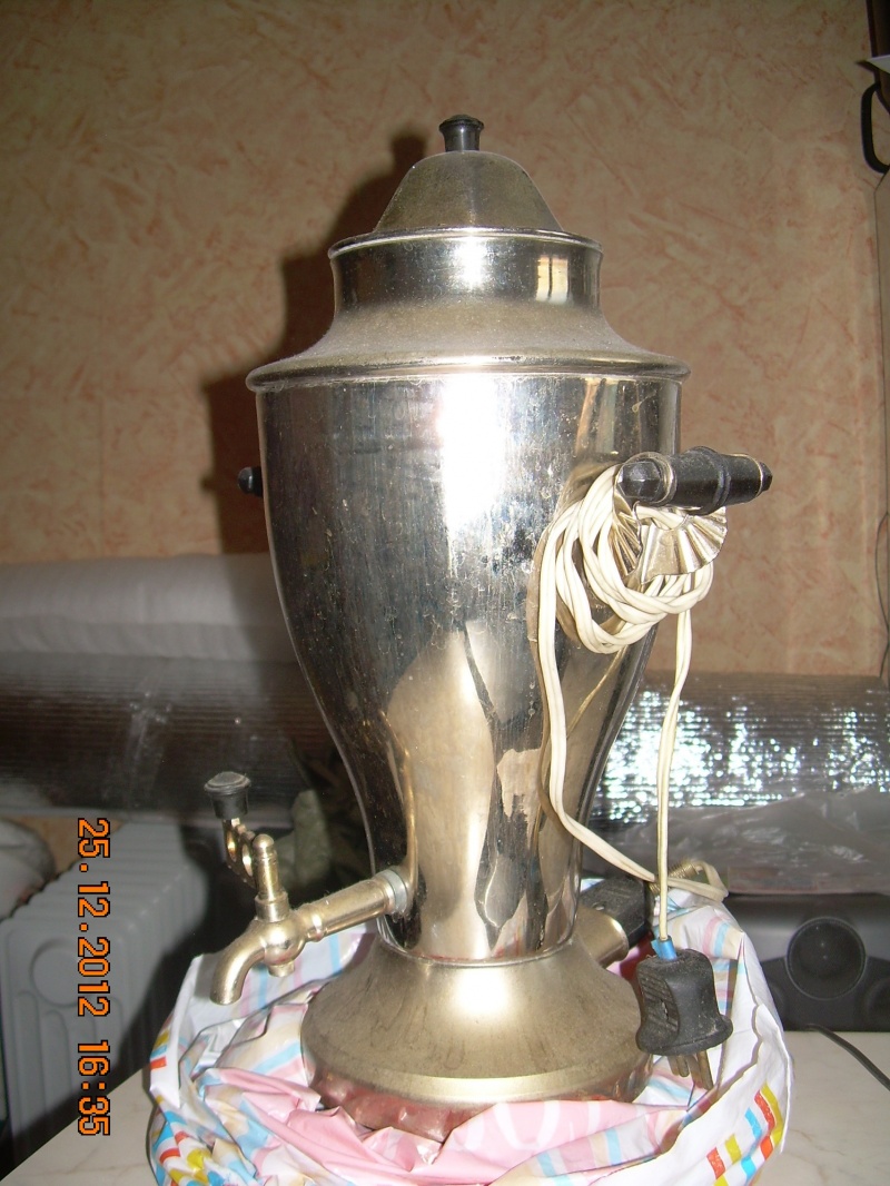1. самовар электрический, работает, использовался не по назначению как стерилизователь банок под соленья, носик не использовали, "присох"...