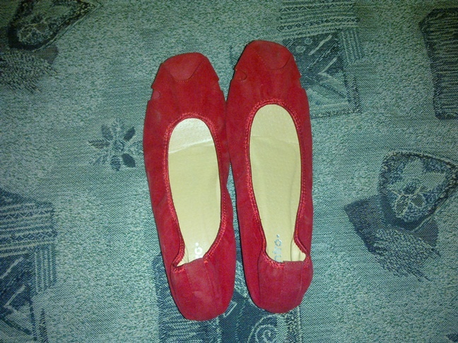 2. Красные типа балетки на невысокой танкетке (примерно 1-2см), р-р 39-40, носила всего пару раз. У одной танкеточка слегка покоцана. Вруг кому на даче пригодится по грядкам ходить.