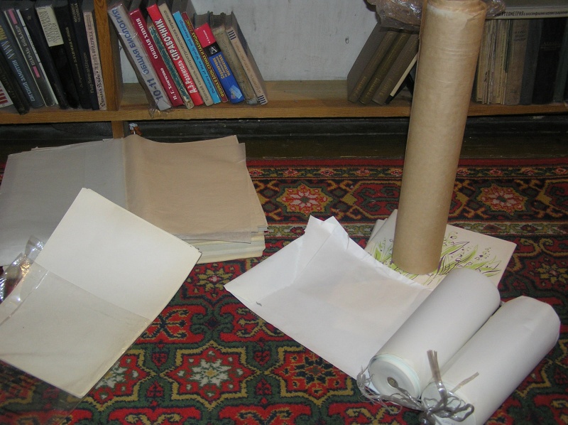 Отдается новая партия бумаги - много А4 типа папиросной, набор бумаги с водяными знаками, рулон коричневой бумаги и 2 рулона маленьких белой.