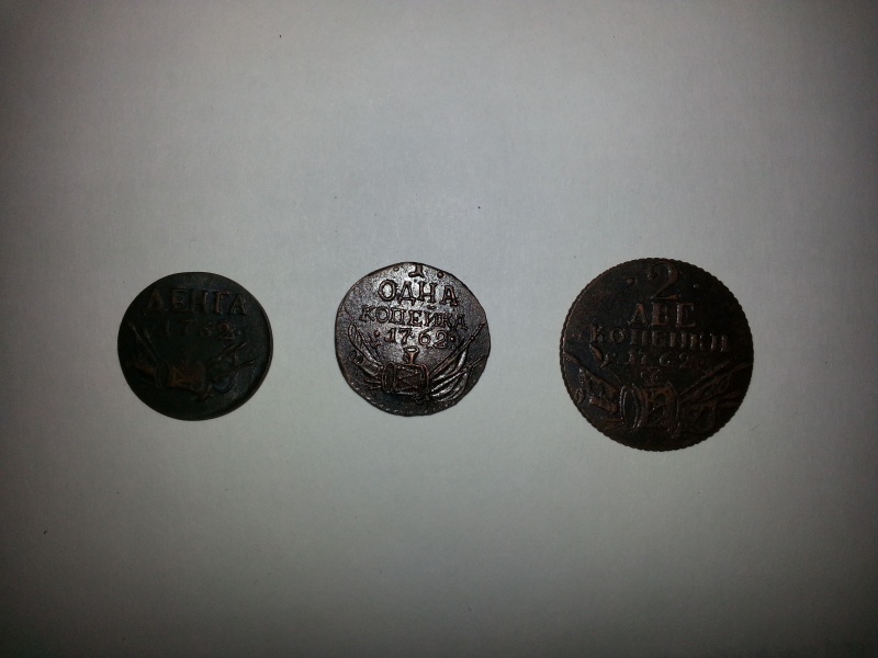 4) В 1762 году были такие монеты, ныне являются большой редкостью, тем более в хорошем качестве. Комплект из 3-х монет сохраняет 100% историческую точность, даже гурт в виде сетки или косых насечек как на реальных монетах, надписей copy нет. Качество выше всяких похвал! Рекомендую! 250 рублей.
