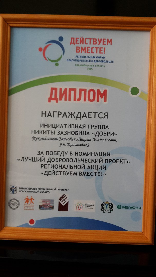 В этом году инициативная группа Никиты Волкова была отмечена дипломами регионального движения «Социальное партнёрство» и городского конкурса «Доброволец-2010» в номинации «Добровольческий поступок года». Награждена грамотами администраций Новосибирского района и рабочего посёлка Краснообск.