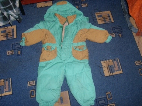 Зимний пуховик-комбинезон, зеленый, года на 1,5-2, цена 300р.длина от воротничка до манжета на штанишке 80см.