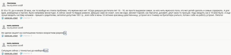 Я на этот раз даже и не подумал, что моё мнение не пропустят, так как оно не нарушает ни одного из Правил комментирования. Поэтому дословно процитировать его не смогу. Но суть была в том, что очередная статья (4ая или 5ая) на моей памяти за ближайшие пару лет, наверное (может я какие-то и пропустил), не отражает адекватной картины по поводу половозрастной структуры населения нашей страны и нска в частности. Как и всегда был сделан акцент только на том, что лиц женского пола по статистике больше, чем лиц мужского. Вместе с тем был намек (и то в неявной форме): "...Рожденные в начале 80-х годов, они составляют почти 51 тыс. человек, при этом их [женщин] почти на 1700 меньше, чем мужчин этого же возраста." И то добавили лишь потому, что неоднократно до этого были замечания на неоднозначность ситуации (от людей более сведущих в статистике). Таким образом особенность изложения материала, незнание сути и особенностей проблематики конкретной темы, да и в принципе такого явления, как статистика, создала у большинства читателей неверное понимание проблемы.