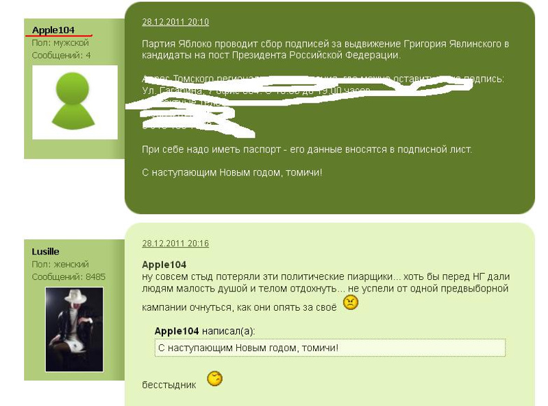 Сегодня мной размещена на политическом форуме информация о проводимом на территории РФ сборе подписей в поддержку Григория Явлинского в качестве кандидата на пост Президента РФ, указаны адреса, где в Новосибирске можно поставить свои подписи в поддержку Явлинского.