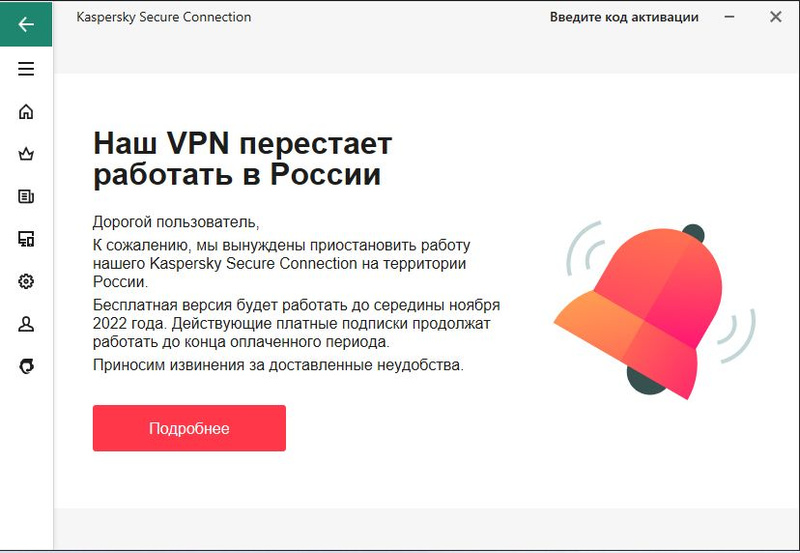 Собственно, Мы приостанавливаем работу и продажи Kaspersky Secure Connection на территории Российской Федерации. Работа бесплатной версии Kaspersky Secure Connection будет приостановлена с 15 ноября 2022 года.