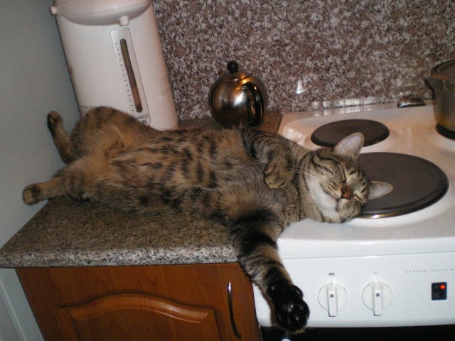!А фото можно посылать на какую-нибудь фотовыставку., так как не всегда коты засыпают на плите. Это еще надо успеть заснять.Ой, да он только там и спит, это его самое любимое место. И тепло (холодильник и чайник всегда теплые) и еду не прокароулишь![]()