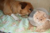 С Фаней тяжело. Она никак не хочет понять ,что надо сесть рядом и не совать во все свой длинный нос. Ей постоянно надо его понюхать ,его мисочку понюхать, шприцы, салфетки, ампулы, бутыльки.... А Дарсик в свою очередь, чуть что - норовит за диван куда-нибудь ускакать. Моих двух рук ну никак не хватает. Ругаюсь на обоих. Фаньку по носу шлепаю. Уже не скулит и не сильно его боится - видимо, хочет всего обнюхать и облизать, а я боюсь, что он ей может вцепиться в морду. Но, когда ест - внимания на нее не обращает.