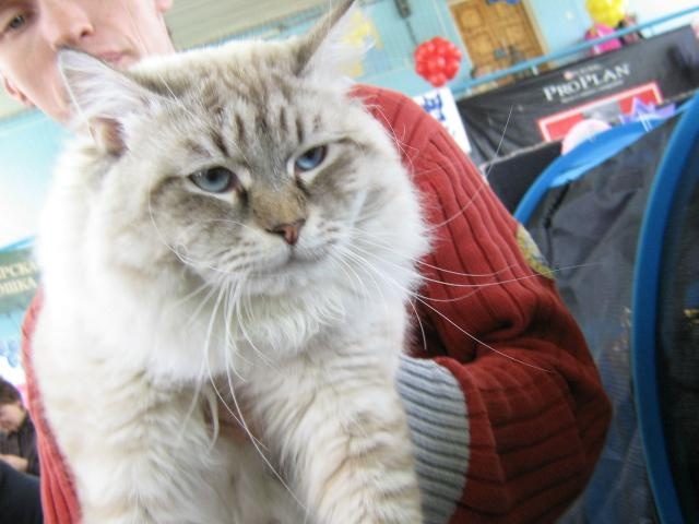 Короче говоря, пришлось мне идти и оставшийся час сидеть с ним на кухне, чтобы было тихо. Войдя на кухню, я обнаружила венец всего произшедшего - Дася покакал на коврике, где стоят кошачьи миски!!!.. Это была кульминация вечера. Так и не знаю, писал ли он вообще за эти 2 дня, т.к. на выставке он категорически писать отказывается. Последний час мы коротали с ним на кухне, я - читая каталог выставки, он - играя с Васькой, который с другой стороны совал лапы под дверь и пытался его достать, а Даська, в свою очередь, лупил его по лапам и совал ему свои.