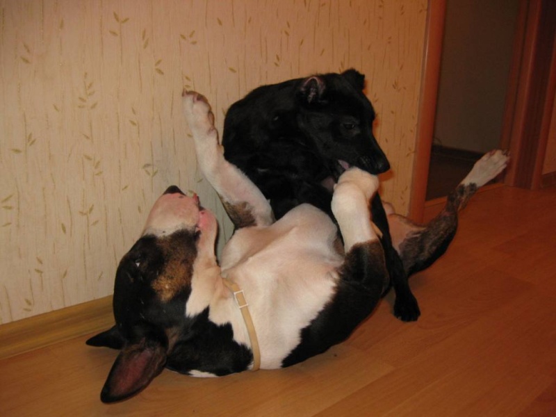 А буль с его низким болевым порогом сначала смотрит на это, а потом когда надоедает - просто отпихивает ее носом А когда они носятся - это вообще опасно для здоровья т.к. полы у нас скользкие и они часто не могут вписаться в поворот, так что можно вполне словить под коленки 2 едущих на попе шара для боулинга. Я уже пару раз так шлепнулась и теперь стала умнее: слышу топот - быстренько улепетываю с пути этого цунами