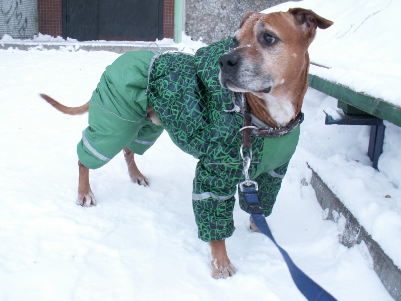 Есть "взрослый" комбез, он еще великоват. Там нету синтепона, только подклад-байка. И плащевка покачественнее. Вот с этим комбезом собака всегда сухая была. Его шили на заказ через Багиру.
