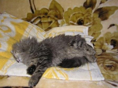 На первой фотке явно подушка под голову не помешала бы. )))Вначале всегда когда хочет спать, подходит, просит чтоб укрыли, без этого не засыпает, если не укрыть-так и будет ходить просить. И всегда строго на подушку, потом бултыхается во сне