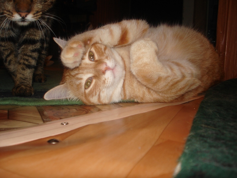 Дася уже часа два носится и мырчит - все пытается Шаню развести на побегать. А Шаня лежит на диване и смотрит на него абсолютно пофигистски. Опять начал ссать на диван - теперь уже из ревности, видимо, что Шане столько внимания уделяется...