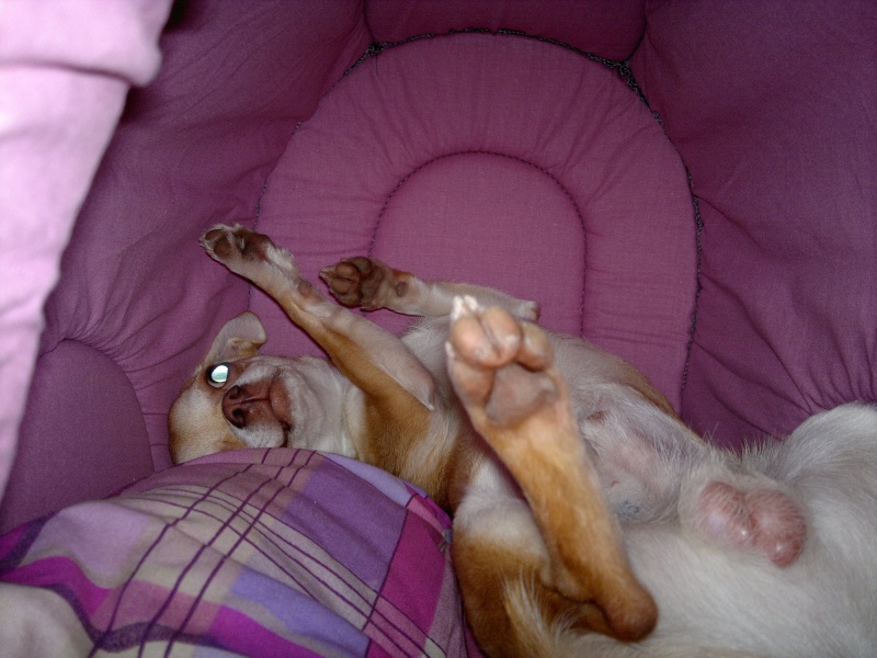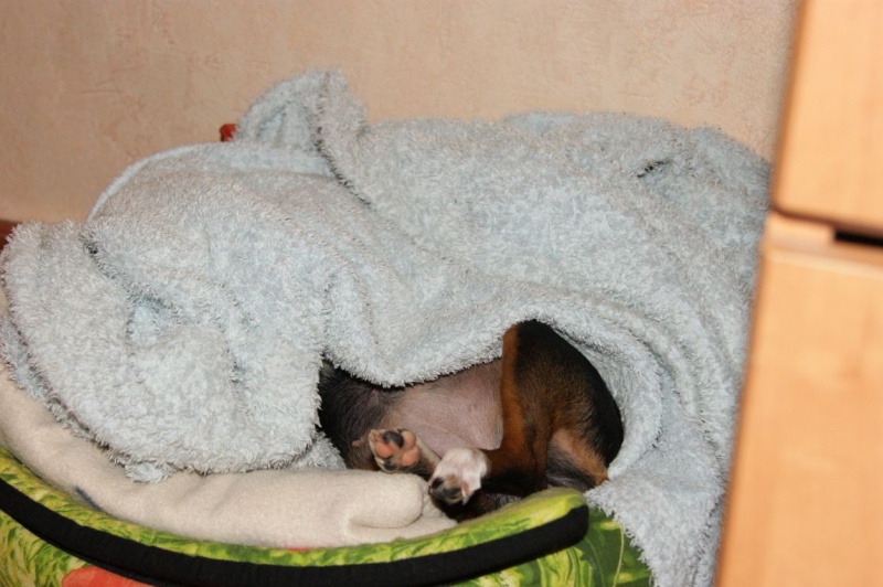 Да это щенок, 2,5 мес. (900гр) - наш с дочкой новогодний подарок. Порода той-терьер, но правда у нас есть сомнения: лапки коротковаты и родилась она без хвостика (бабушка не совсем легально была ввезена в Россию, и все детки у нее рождались без хвостика как и мама нашей крохи), но нам все равно, она наша красавица и любимица