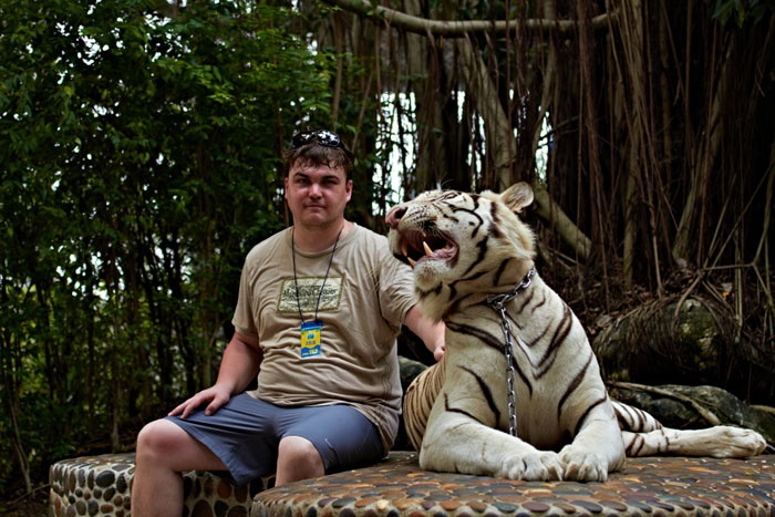 Самое ужасное, что когда я к нему присел, таец, который за ним присматривает, начал его палкой тыкать, чтобы он эффекто в кадр рычал - пипец!!!! - непередаваемые впечатления, когда тигр возле тебя огрызается и рычит - аж майка вся взмокла![]()