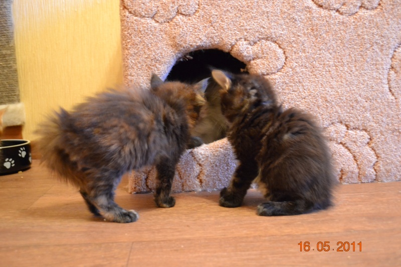 Вчера начала знакоить котят со взрослым кошачьим коллективом. Первой, конечно, стала почетная няня Люся! Люська по-свойски проскочила в домик, я за ней. Заглядываю, Люська развалилась и урчит, а вокруг - вздыбленные котята! Потом котята из домика повыскакивали, но их боевую позу я все же успела заснять!