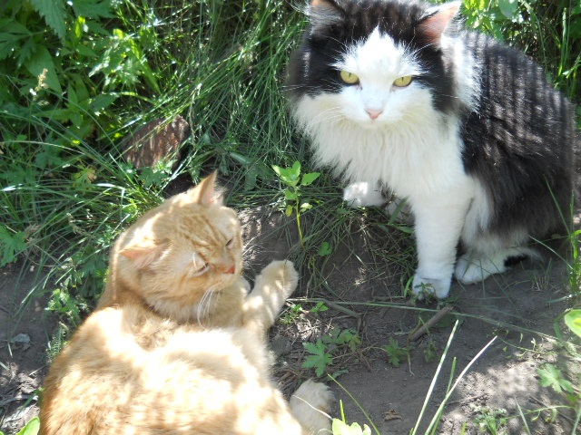 Один отвлекает - другой нападает. Соседский кот сначала попытался права качать, но потом только пятки засверкали